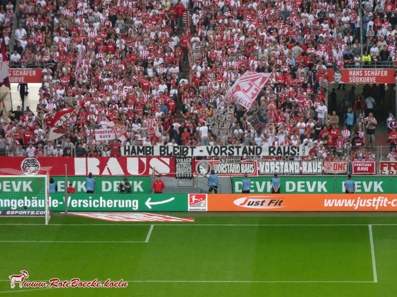 Während der Partie präsentierten die Fans in der Südkurve weitere an den FC-Vorstand gerichtete Banner. „Euer Demokratieverständnis – Made in China“ lautete ein Vorwurf. Dass die Kölner Spieler weiterhin unterstützt werden, stellten die Gruppen ebenfalls klar: „Unsere Stimmen für die Mannschaft! Unsere Stimmen gegen die Vereinsführung!“ prangte auf einem der Spruchbänder.