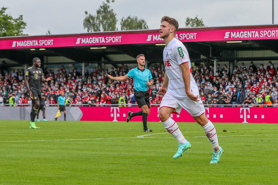 Hectors langen Ball aus der eigenen Hälfte über die zu weit aufgerückte Bayern-Abwehr in den Lauf von Jan Thielmann konnte der schnelle Nachwuchsstürmer kaltschnäuzig im linken Eck versenken. Nicht nur dadurch setzte sich das FC-Eigengewächs in Szene. Immer wieder profitierte Thielmann von seiner in der Pause offenkundig verbesserten Physis – im Spiel mit dem Ball als auch im Pressing gegen den Spielaufbau der Bayern zeigte sich der 19-Jährige sehr präsent. Auch Sturmpartner Modeste musste in der Spitze immer wieder gegen den Ball arbeiten, weil der erste Gedanke nach dem Ballverlust unter Steffen Baumgart nicht selten „direkte Rückeroberung“ heißt. Hätten sich die Stürmer in der letzten Saison gleich nach hinten fallen lassen, scheint es in dieser Spielzeit eine neue vorgegebene Marschrichtung von der Seitenlinie zu geben.