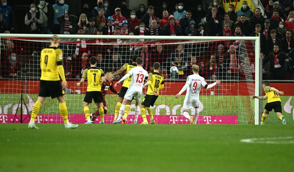 Der ersatzgeschwächte FC, der unter anderem auf Jonas Hector und Ellyes Skhiri verzichten musste, begann gegen die Dortmunder gewohnt aggressiv und mutig. Den ersten Treffer setzte allerdings der BVB: Bei einem langen Ball spielten die “Geißböcke” vergeblich auf Abseits, der Ex-Kölner Marius Wolf nutzte das zum frühen 1:0 für die Gäste (8.). Das Baumgart-Team antwortete mit viel Leidenschaft und großem Einsatz, die letzte Durchschlagskraft fehlte allerdings noch. Für Dortmund vergab Erling Haaland das mögliche 2:0 (25.), beim FC näherte sich Mark Uth dem Tor der Schwarzgelben zweimal an (27./28.). Der verdiente Ausgleich fiel dennoch vor der Pause: Horns Flanke verlängerte Modeste auf den zweiten Pfosten, dort drückte Andersson den Ball zum 1:1 über die Linie (36.).