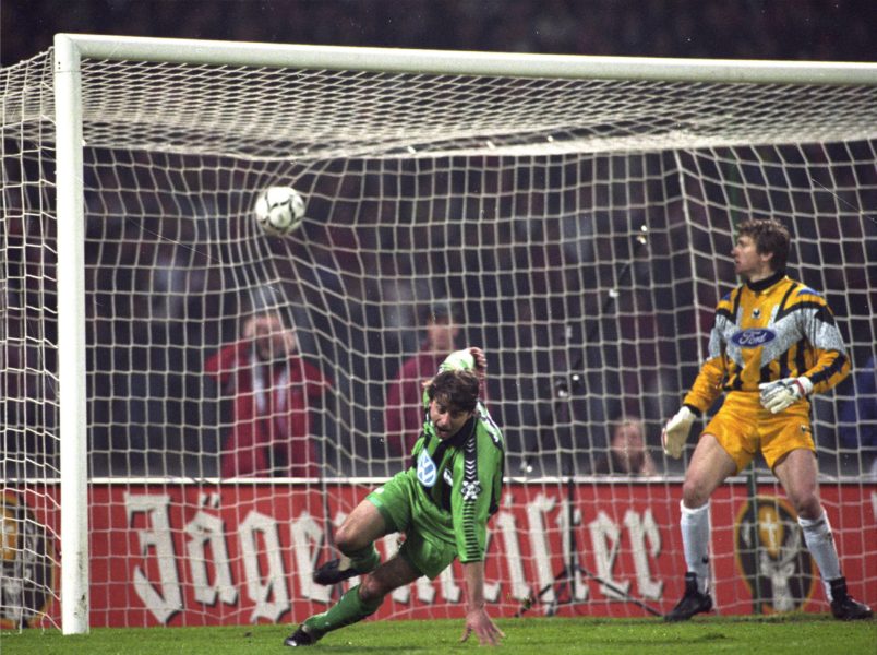 Ähnlich dachte gefühlt halb Köln, das sich bereits Hotelreservierungen und Tickets für den großen Tag in Berlin zulegte. Wer war denn bitte schon der VfL Wolfsburg? Klar, die waren in der 2. Bundesliga jetzt nicht so schlecht unterwegs und auf Aufstiegskurs. Der Weg ins Halbfinale wirkte allerdings nicht sonderlich spektakulär: Die Amateure des FC Schalke 04, Eintracht Frankfurt, Bayern-Schreck TSV Vestenbergsgreuth sowie die Amateure des FC Bayern München waren die Hürden, die die „Wölfe“ bis zur Vorschlussrunde zu überwinden hatten. Die bekanntesten Namen in Diensten der Niedersachsen: Der ehemalige Kölner Jann Jensen in der Abwehr, die Zweitliga-Haudegen Holger Ballwanz und Detlev Dammeier, der spätere FC-Spielmacher Claus-Dieter Wollitz, Torjäger Siggi Reich. Nichts, wovor sich der glorreiche 1. FC Köln in die Hose machen müsste.