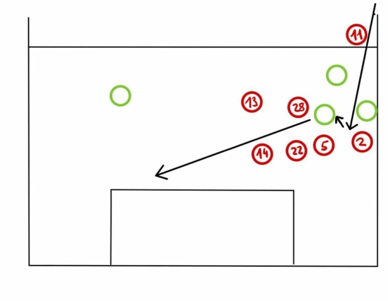 Durch die offensive Besetzung der Raute wurde eine defensive Baustelle besonders offensichtlich: Was Dejan Ljubicic als Spieler mit den ligaweit meisten intensiven Läufen noch häufiger kaschieren kann, wurde vor dem Rückstand besonders gut sichtbar: Die zentrale Raute kann durch Verlagerungen leicht ausgespielt werden. Sinnbildlich dafür steht das 1:0 der Aufsteiger. Jetro Willems gibt einen Einwurf die Linie herunter und dorthin zieht es neben den beiden Innenverteidigern Meré und Czichos auch Kainz und Skhiri. Weil auch Kapitän und Linksverteidiger Hector weit nach rechts schiebt, entblößt der FC in dieser Situation seine gesamte linke Seite.