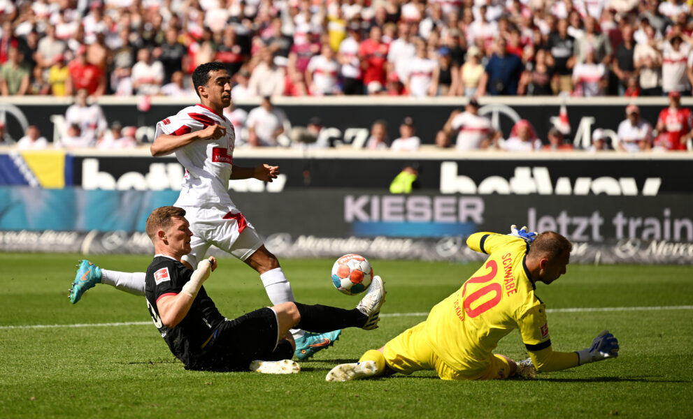 Im sonnendurchfluteten Stuttgarter Stadion machte der VfB von Beginn an deutlich, dass er alles, aber auch wirklich alles in die Waagschale werfen würde, um die Relegation zu vermeiden und den Klassenerhalt schon in dieser Partie zu sichern. Und so sahen sich etwas schläfrig wirkende Kölner temporeichen Angriffen der Schwaben ausgesetzt, die Wirkung hinterließen. Etwa bei Innenverteidiger Luca Kilian, der ebenso ungeschickter- wie unnötigerweise Stuttgarts Stürmer Tiago Tomás im eigenen Sechzehner zu Fall brachte – Elfmeter für den VfB (11.). Sasa Kalajdzic trat an, schoss platziert in die linke Ecke des Kölner Tores – und Marvin Schwäbe bugsierte den Ball mit einer unglaublichen Parade über die Latte seines Gehäuses.