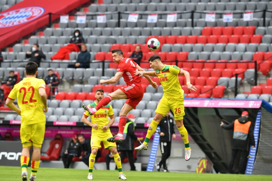 Zu Beginn der Partie produzierte der 1. FC Köln gleich mehrere vermeidbare und gefährliche Ballverluste: Alleine in den ersten drei Minuten erst durch Wolf, dann durch Sava Čestić (ein zu kurzer Rückpass brachte Timo Horn in Bedrängnis) und Ellyes Skhiri. Die Grundaufgabe gelang allerdings in diesem Zeitraum noch relativ gut: Durch hohe Laufintensität gelang es den Kölnern, immer wieder die Räume zu schließen und die Bayern zu Zweikämpfen zu zwingen. Wie so oft in dieser Saison waren die eroberten Bälle dann aber schnell wieder weg. Emmanuel Dennis hatte als einziger nomineller Stürmer wie schon in den vorherigen Partien einen enorm schweren Stand. Bis zu seiner Auswechslung in der Halbzeit kam er auf 26 Ballaktionen, davon drei Pässe, eine Flanke und zwei misslungene Dribblings im letzten Drittel. Für einen Stürmer ganz eindeutig viel zu wenig. Meistens wurden erneut lange Bälle gespielt, die für die Münchner Defensive kein Problem waren.