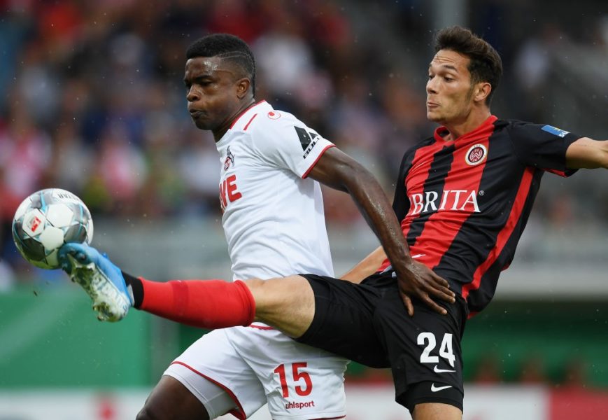 Gegen den Zweitliga-Aufsteiger aus der hessischen Landeshauptstadt kam die Mannschaft von Trainer Achim Beierlorzer allerdings schwer ins Spiel. Zu Beginn hatten die Gastgeber auch die besseren Möglichkeiten, Shipnowskis Heber nach drei Minuten fand jedoch nicht den Weg ins Tor. Auch nach 21 Minuten war der FC im Glück, als ein weiterer Heber von Dittgen im Eins-gegen-Eins gegen Horn geklärt werden konnte. Danach steigerte sich der 1. FC Köln und kam vermehrt über Flanken zu torgefährlichen Aktionen. Die Führung entsprang dann einer starken Einzelleistung von Florian Kainz, der auf links fintierte und dann auf Cordobas Kopf flankte – 1:0 nach 39 Minuten. Nur drei Minuten später traf der Österreicher mit einem Seitfallzieher nach einer Flanke von Schindler zum zweiten Tor – und zur beruhigenden Führung.