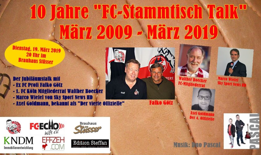 Es gibt etwas zu feiern im Hause FC-Stammtisch Talk: Am 19. März begeht die traditionsreiche Talkrunde mit Gastgeber Ralf Friedrichs im Brauhaus Stüsser sein zehnjähriges Jubiläum. Um dies würdig zu begehen und dabei hochwertig über den 1. FC Köln zu diskutieren, ist wieder ein illustres Gästequartettt am Start. Neben Ex-FC-Spieler Falko Götz ist auch der neue stellvertretende Mitgliederratsvorsitzende Walther Boecker dabei.