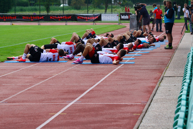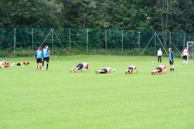 Statt genügend Getränke gab es eine lockere Einheit zu bewundern. Die Spieler, die im Test gegen Innsbruck eingesetzt wurden, durften sich im Fußballtennis versuchen, während die anderen Akteure Passübungen und Torabschlüsse fabrizierten. Neben den angeschlagenen Slawomir Peszko und Patrick Helmes, der heute im Hotel individuell behandelt wurde, fehlten noch drei weitere Kicker: Daniel Mesenhöler, André Wallenborn und auch Shootingstar Lucas Cueto reisten aus Kitzbühel ab, um sich mit der U21 auf die kommende Saison vorzubereiten.