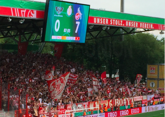 Dem kann man sich nur vollumfänglich anschließen, denn der gemeine effzeh-Fan erwartete wohl eher ein lockeres Scheibenschießen, bei dem man den Sechstligisten in Adiletten zweistellig aus dem Stadion fegt. Ohne jetzt die vielleicht nur befriedigende Leistung der Profimannschaft des effzeh überstrapazieren zu wollen: man muss Preußens Trainer Andreas Mittelstädt und seiner Mannschaft ein Kompliment zollen, da sie es als Amateurmannschaft immer wieder versucht haben, einen Bundesligisten durch frühes Anlaufen unter Druck zu setzen. Es mag Spiele in der jüngeren Vergangenheit gegeben haben, in der sich unterklassige Mannschaften im besten Mourinho-Stil hinter dem Mannschaftsbus verschanzt haben, was allerdings nicht dem Stil der Preußen zu entsprechen scheint. Mittelstädts Mannschaft stellte im Gegensatz dazu unter Beweis, dass der vollmundigen Ankündigung, mittelfristig in die Regionalliga aufsteigen zu wollen, auch auf dem Trainingsplatz Folge geleistet wird. Wenn dann die Spieler nur drei- bis viermal trainieren können und am Ende eine solche Leistung steht, kann man aber wirklich nur den Hut ziehen.